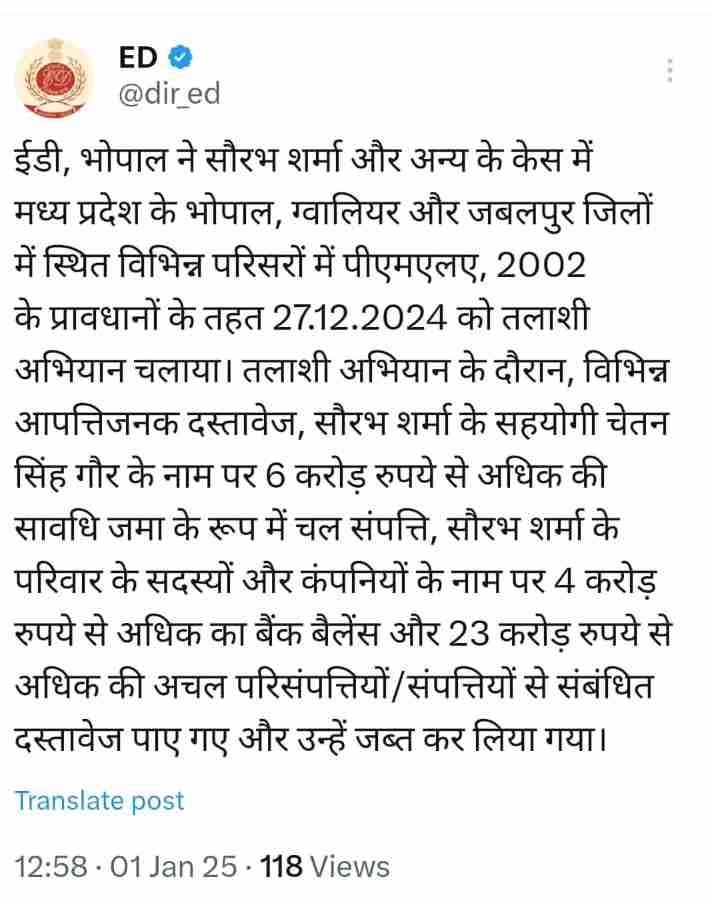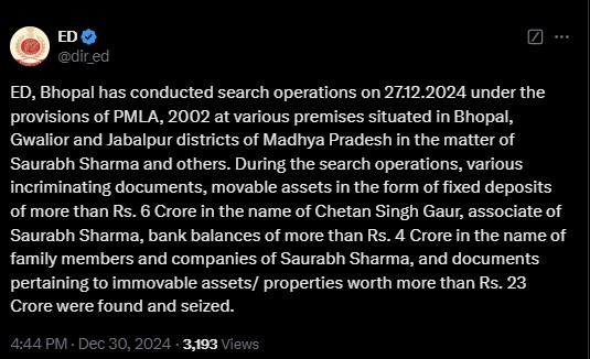 इससे पहले ED ने 30 दिसंबर को एक्स पर पोस्ट कर छापे की जानकारी दी थी। एक्स पर पोस्ट कर प्रवर्तन निदेशालय ने बताया था, “भोपाल ने सौरभ शर्मा और अन्य के मामले में मध्य प्रदेश के भोपाल, ग्वालियर और जबलपुर जिलों में स्थित विभिन्न परिसरों में पीएमएलए, 2002 के प्रावधानों के तहत 27.12.2024 को तलाशी अभियान चलाया। तलाशी अभियान के दौरान, विभिन्न आपत्तिजनक दस्तावेज, सौरभ शर्मा के सहयोगी चेतन सिंह गौर के नाम पर 6 करोड़ रुपये से अधिक की सावधि जमा के रूप में चल संपत्ति, सौरभ शर्मा के परिवार के सदस्यों और कंपनियों के नाम पर 4 करोड़ रुपये से अधिक का बैंक बैलेंस और 23 करोड़ रुपये से अधिक की अचल संपत्ति/संपत्ति से संबंधित दस्तावेज पाए गए और उन्हें जब्त कर लिया गया।”