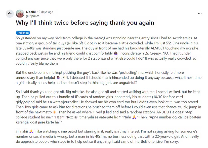 लड़की ने लिखा कि एक यात्री के बैग से उसका चेहरा टकराने ही वाला था, तभी पास खड़े 30-40 साल के एक अंकल ने उस यात्री को हल्का धक्का देकर उसे “बचाने” की कोशिश की। छात्रा ने सोचा कि अगर वह इसका आभार व्यक्त नहीं करेगी, तो आगे चलकर शायद कोई और भी मदद करने से हिचके। इसलिए, मेट्रो से उतरते वक्त उसने “थैंक्यू” कह दिया।