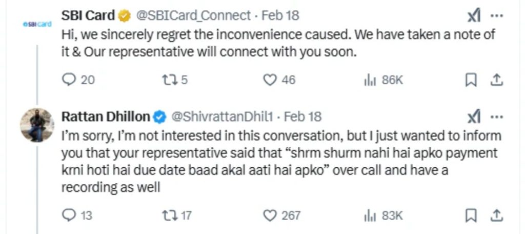 हालांकि, SBI कार्ड की प्रतिक्रिया से ढिल्लों असंतुष्ट थे और उन्होंने कहा कि वह आगे की बातचीत में इंटरेस्टेड नहीं है। उन्होंने यह भी बताया कि उनके पास उस बातचीत की रिकॉर्डिंग भी है, जिसमें SBI प्रतिनिधि ने कथित रूप से कहा, “शर्म नहीं है आपको, पेमेंट करनी होती है, ड्यू डेट के बाद अक्ल आती है आपको,” जिसमें यह संकेत दिया गया था कि ढिल्लों के पास कोई शर्म नहीं है और वे केवल देय तिथि (Due Date) के बाद भुगतान के महत्व को समझते हैं। हालांकि, SBI कार्ड का आधिकारिक खाता एक्स पर रतन ढिल्लों की पोस्ट पर प्रतिक्रिया दे चुका है, लेकिन बैंक ने ऐसे आरोपों पर अभी तक कोई आधिकारिक बयान शेयर नहीं किया है।
