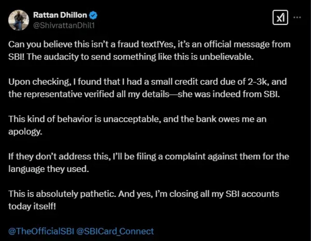 एक्स पर रतन ढिल्लों नाम के एक ग्राहक ने स्टेट बैंक ऑफ इंडिया (SBI) के क्रेडिट कार्ड एग्जीक्यूटिव द्वारा बकाया राशि को लेकर भेजे गए एक अपमानजनक मैसेज को लेकर नाराजगी जताई है। एक्स (पूर्व में ट्विटर) पर अपनी पोस्ट में, रतन ढिल्लों ने इस मैसेज का स्क्रीनशॉट भी शेयर किया है और अपनी नाराजगी व्यक्त की है। उन्होंने आगे कहा कि वह एक आधिकारिक SBI प्रतिनिधि की तरफ से ऐसे भेजे गए मैसेज से मैं सॉक्ड हैं।