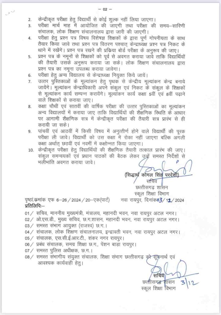 प्रत्येक शैक्षणिक सत्र में कक्षा पांचवी, कक्षा आठवी की नियमित परीक्षा ली जाएगी. यदि विद्यार्थी वार्षिक परीक्षा में अनुत्तीर्ण होता है तो उसे परीक्षा दिनांक के दो माह के भीतर फिर से परीक्षा का अवसर दिया जाएगा. किसी भी विद्यार्थी को प्रारंभिक शिक्षा पूर्ण होने तक विद्यालय से निष्कासित नहीं किया जाएगा. सीजी बोर्ड के सभी सरकारी, अशासकीय, अनुदान प्राप्त स्कूल में परीक्षा आयोजित की जाएगी.