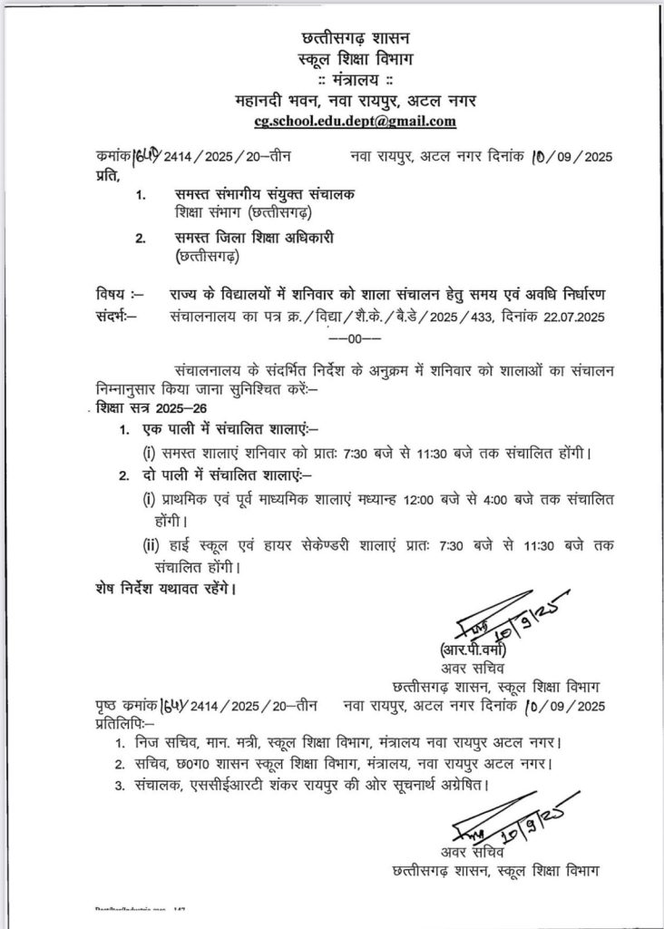 सत्या राजपूत, रायपुर। राज्य सरकार ने स्कूल संचालन के समय में बदलाव करते हुए शनिवार के लिए नई समय सारणी जारी की है। स्कूल शिक्षा विभाग ने इस संबंध में सभी जिलों के जिला शिक्षा अधिकारियों और संभागीय संयुक्त संचालकों को आदेश जारी कर दिया गया है। जारी आदेश के अनुसार, अब शनिवार को एक पाली और दो पाली में संचालित विद्यालय अलग-अलग समय पर चलेंगे।