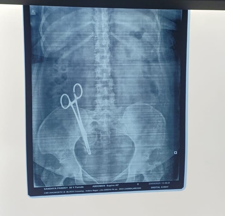 लखनऊ. श्री मेडिकल केयर, इंदिरानगर में 17 साल पहले एक सीजेरियन डिलीवरी हुई थी. ऑपरेशन के दौरान महिला के पेट में कैंची छूट गई. इसका खुलासा 17 साल बाद हुआ. जब महिला का एक्स-रे (X-ray) निकाला गया. रिपोर्ट देख डॉक्टर्स के भी होश उड़ गए. वे भी एक्स-रे देखकर हैरान रह गए. इस मामले में महिला के पति अरविंद पांडेय ने गाजीपुर पुलिस में तहरीर दी है.