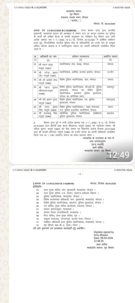 एमपी में कानून-व्यवस्था की बेहतर मॉनिटरिंग, पुलिस कार्यों की प्रभावी समीक्षा और समन्वय को मजबूत करने के लिए वरिष्ठ IPS अधिकारियों को जिम्मा सौंपा है। गृह विभाग के आदेश के मुताबिक, ADG राजा बाबू सिंह को शहडोल संभाग, DG जेल वरुण कपूर को भोपाल संभाग, स्पेशल DG जेल उपेंद्र कुमार को उज्जैन संभाग का प्रभार सौंपा गया है।