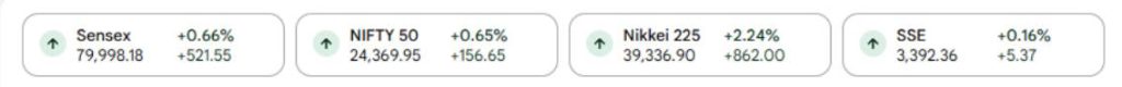 सुबह 10 बजे S&P BSE सेंसेक्स 591.87 पॉइंट या 0.74% की बढ़त के साथ 80,068.50 स्तर पर ट्रेडिंग कर रहा था, जबकि NIFTY50 इंडेक्स 180.05 पॉइंट या 0.74% की बढ़त के साथ 24,393.35 स्तर पर ट्रेडिंग कर रहा था,