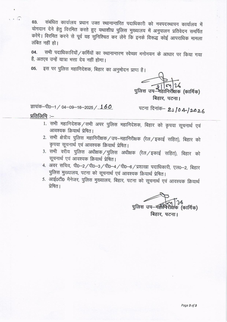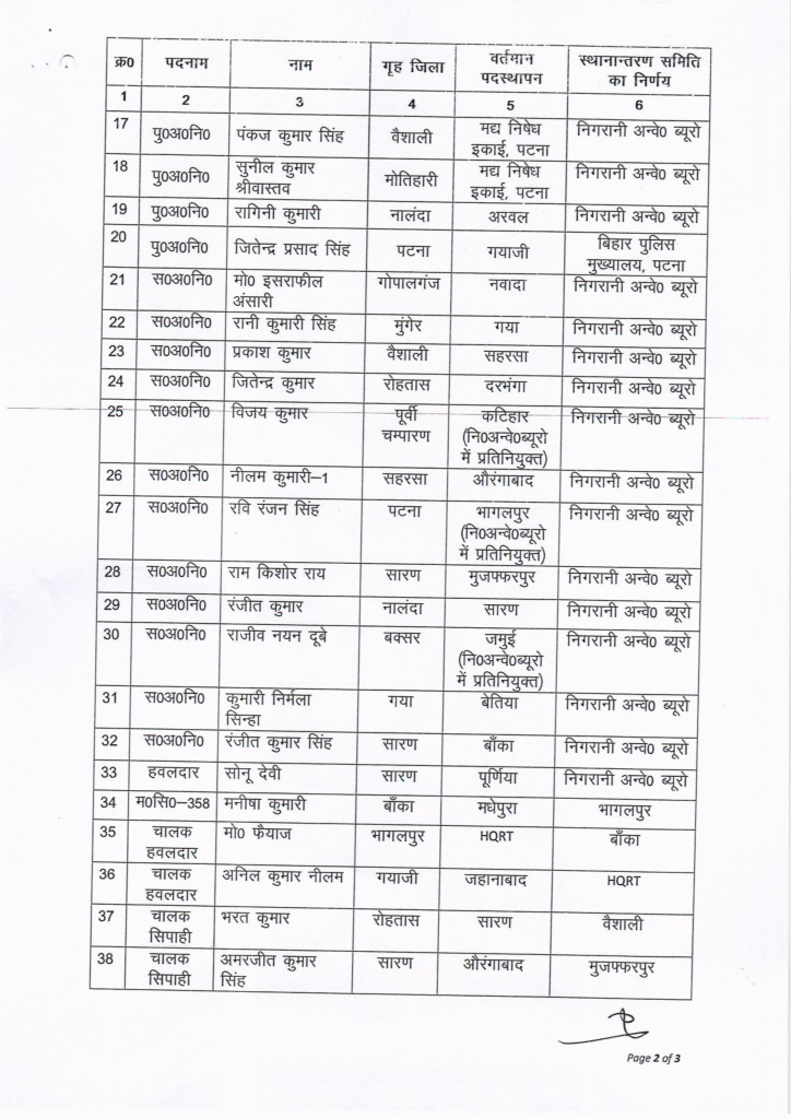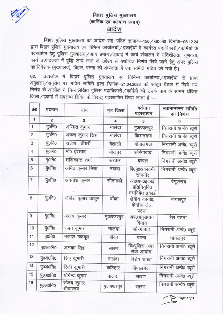 Bihar Police Transfer: बिहार सरकार ने बड़ा प्रशासनिक फेरबदल किया है। प्रदेश में कानून-व्यवस्था को और मजबूत बनाने के लिए सरकार और पुलिस मुख्यालय ने यह बड़ा कदम उठाया है। बता दें कि राज्य में नई सरकार बनने के बाद पहली बार एक साथ बड़ी संख्या में पुलिस पदाधिकारियों का ट्रांसफर व पोस्टिंग की गई है, जिससे प्रशासनिक महकमे में हलचल मच गई है।