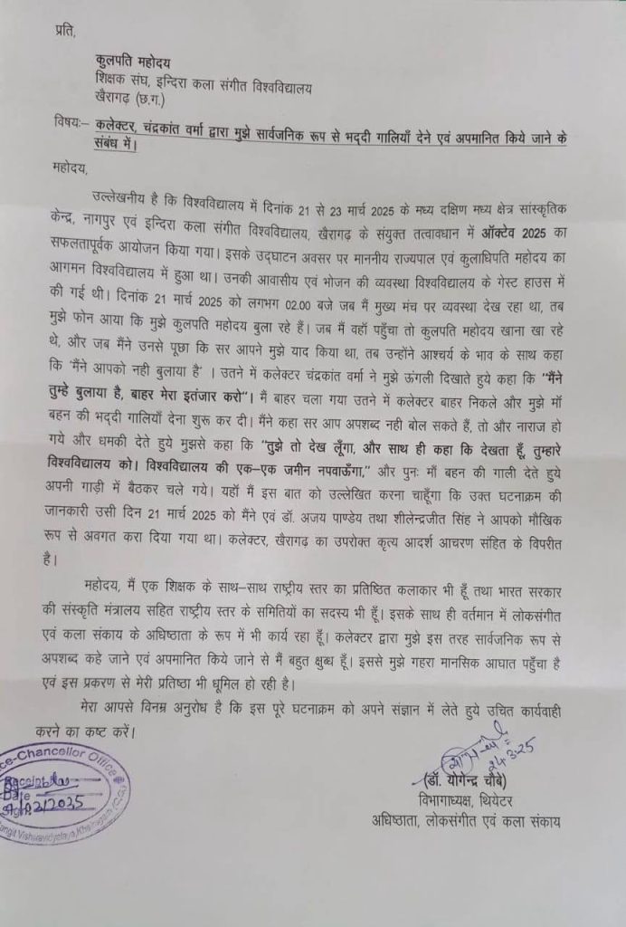 दरअसल, इंदिरा कला संगीत विश्वविद्यालय में ऑक्टेव फेस्टिवल के अवसर पर राज्यपाल रमेन डेका का खैरागढ़ प्रवास हुआ था. इस दौरान विश्वविद्यालय प्रबंधन की व्यवस्थाओं में लापरवाही को लेकर कलेक्टर चंद्रकांत वर्मा ने जिम्मेदार अधिकारियों को फटकार लगाई थी. इसी कार्यक्रम में डॉ. योगेंद्र चौबे भी मौजूद थे. हालांकि, बाद में कलेक्टर और विश्वविद्यालय प्रशासन के बीच बैठक के जरिए मामला आपस में गले मिल कर सुलझा लिया गया. लेकिन 24 मार्च को डॉ. योगेंद्र चौबे ने कुलपति को कलेक्टर के खिलाफ लिखित शिकायत दी. जो पत्रर सोशल मीडिया पर वायरल हुआ. इसके बाद सोशल मीडिया पर इस कार्रवाई को लेकर विरोध शुरू हो गया.