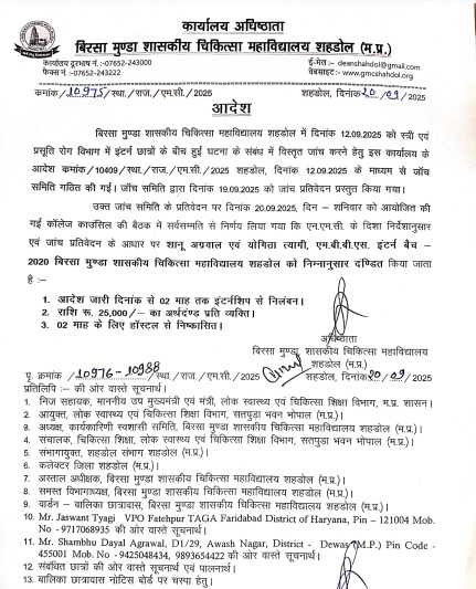 अजयारविंद नामदेव, शहडोल। मध्य प्रदेश के शहडोल के बिरसा मुंडा मेडिकल कॉलेज से बड़ा मामला सामने आया। जहां लेबर रूम (प्रसूता वार्ड) में इंटर्न छात्राओं के मारपीट और हंगामा करने का मामला अब कॉलेज प्रबंधन ने सख्ती से निपटाया है। इंटर्न छात्रा शानू अग्रवाल और योगिता त्यागी को दो माह के लिए इंटर्नशिप से निलंबित कर दिया गया है। साथ ही दोनों को दो माह तक हॉस्टल से निष्कासित किया गया है और प्रति छात्रा 25,000 रुपये का अर्थदंड भी लगाया गया है।