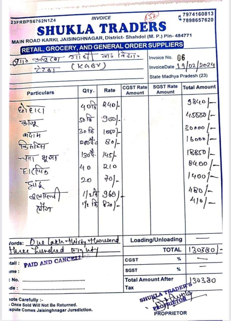 यह मामला जयसिंहनगर ब्लॉक के कस्तूरबा गांधी स्कूल का है। छात्रावास में बच्चों को काजू, बादाम, छुहारा और किशमिश खिलाने का बिल सामने आया है। 1 लाख 30 हजार रुपए से ज्यादा का भुगतान छात्रावास अधीक्षक ने कराया। 50 किलो काजू, 30 किलो बादाम, 40 किलो छुहारा और 200 पैकेट किशमिश छात्रों को बिना खिलाए बिल निकालने का आरोप है।