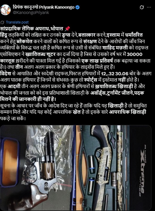 राष्ट्रीय मानवाधिकार आयोग (NHRC) सदस्य प्रियंक कानूनगो ने सोशल मीडिया प्लेटफॉर्म एक्स पर लिखा, ‘सांप्रदायिक लैंगिक अपराध, भोपाल। हिंदू लड़कियों को लक्षित कर उनको ड्रग्स देने, बलात्कार करने, इस्लाम में धर्मांतरित करने हेतु ब्लैकमेल करने वालों को कथित रूप से संरक्षण देने के आरोपों की जांच जिन व्यक्तियों के विरुद्ध चल रही है। कथित रूप से उसी से संबंधित शाहिद मछली को राइफल एसोसिएशन ने ख्यातिलब्ध शूटर का दर्जा दिया है। जिस से उसको वर्ष भर में 30000 कारतूस खरीदने की पात्रता मिल गई है (जिसको एक लाख प्रतिवर्ष तक बढ़ाया जा सकता है।) तथा तीन अलग अलग प्रकार के हथियार के लाइसेंस मिले हुए हैं।’