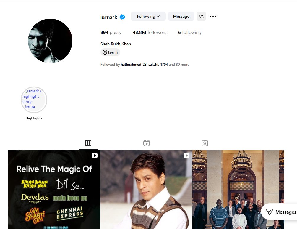 बता दें कि दुनियाभर में शाहरुख खान (Shahrukh Khan) की काफी अच्छी फैन फॉलोइंग हैं. उनके इंस्टाग्राम पर 48 मिलियन फॉलोअर्स हैं. लेकिन वो सिर्फ 6 लोगों को फॉलो करते हैं. जिसमें उनकी पत्नी गौरी खान (Gauri Khan), बेटी सुहाना खान (Suhana Khan), भतीजी आलिया चिब्बा (Alia Chhiba), मैनेजर पूजा ददलानी (Pooja Dadlani), काजल आनंद (Kajal Anand) और आर्यन खान (Aryan Khan) हैं.