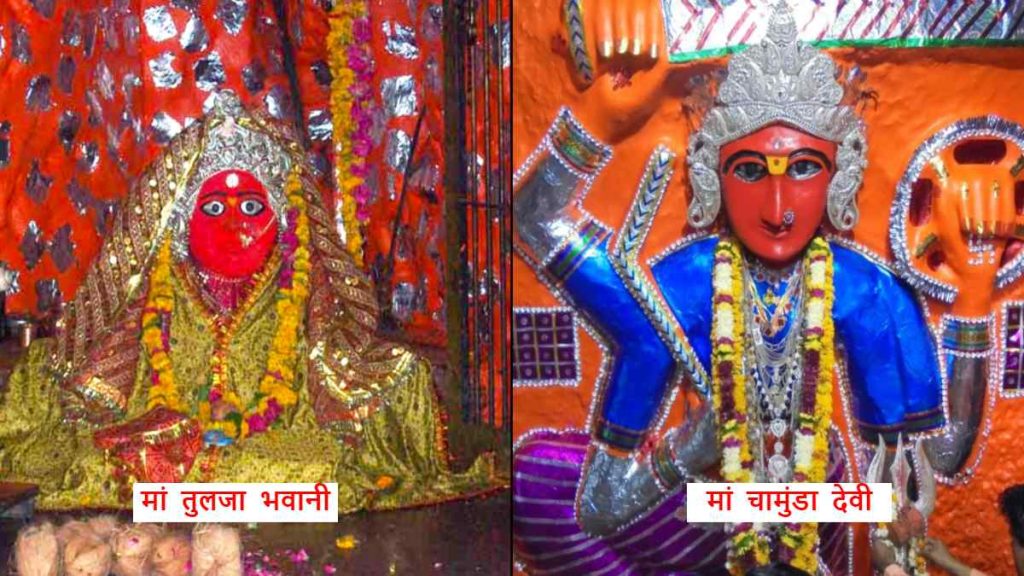 माना जाता है कि मां चामुंडा और तुलजा भवानी बहनें हैं। तुलजा भवानी बड़ी और चामुंडा देवी छोटी बहन हैं। यह दोनों बहनें इस पहाड़ी पर एक साथ रहती थीं, लेकिन एक-दूसरे से मतभेद होने की वजह से वे एक-दूसरे से दूर हो गईं। गुस्से में आकर अपना स्थान छोड़ने लगीं। तुलजा भवानी पाताल लोक में गायब हो गईं, जबकि चामुंडा देवी पहाड़ी से नीचे उतरने लगीं। इस बीच भगवान हनुमान और भैरव बाबा ने हस्तक्षेप किया। उन्होंने देवियों से शांत होने और रुकने की बात कही। हालाकि इस समय तक तुलजा भवानी के शरीर का एक हिस्सा पहले ही पाताल में डूब चुका था। वह पहाड़ी पर उसी स्थिति में रहीं। जबकि चामुंडा देवी, जो नीचे उतर रही थीं, वह अपने वर्तमान स्थान पर रुक गईं। यही वजह है कि तुलजा भवानी का मुख दक्षिण और चामुंडा देवी का मुख उत्तर की तरफ है। टेकरी पर पहुंचने वाले तीर्थयात्री परिक्रमा करते हैं। इसकी शुरुआत तुलजा भवानी से होती है और चामुंडा देवी के दर्शन के साथ समाप्त होती है।