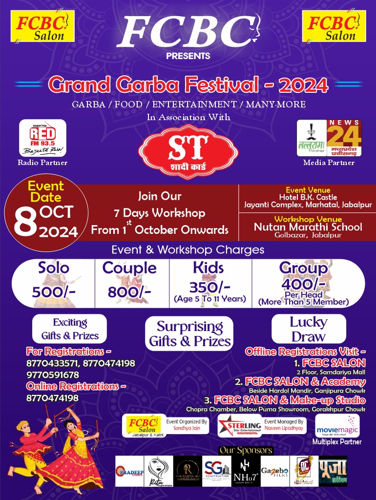 कुमार इंदर, जबलपुर। मध्य प्रदेश (Madhya Pradesh) की संस्कारधानी जबलपुर (Jabalpur) में FCBC सैलून की संचालिका संध्या जैन की ओर से 8 अक्टूबर को ग्रैंड गरबे का आयोजन किया जा रहा है। विजेता को गोल्ड प्राइस और सेकंड विनर को सिल्वर प्राइज से सम्मानित किया जाएगा। इस आयोजन में न्यूज़ 24 मध्य प्रदेश-छत्तीसगढ़ (News 24 Madhya Pradesh-Chhattisgarh) और लल्लूराम डॉट कॉम (Lalluram.com) मीडिया पार्टनर की भूमिका निभा रहा है।