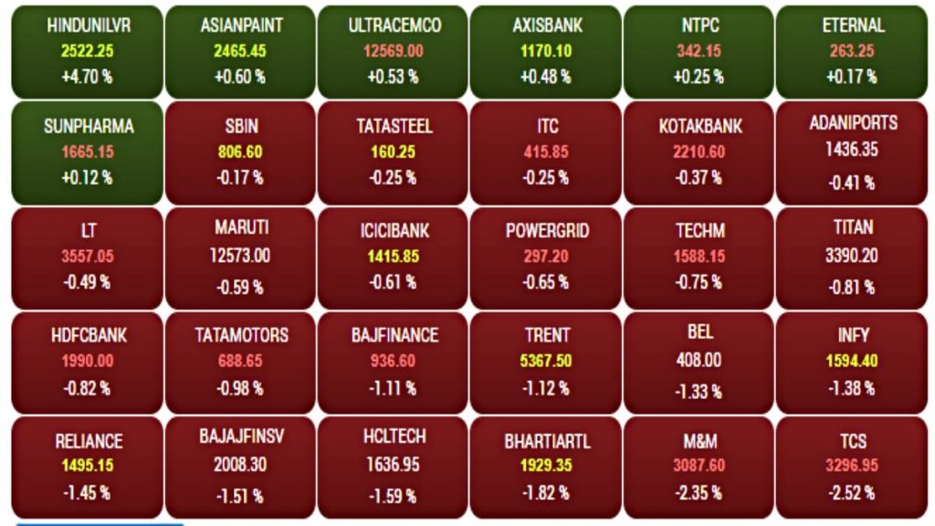 Share Market Update: आज हफ्ते के आखिरी कारोबारी दिन शेयर बाजार की शुरुआत कमजोर रही. सेंसेक्स में −587.29 (0.71%) अंकों के साथ 82,602.99 पर कारोबार कर रहा है, वहीं निफ्टी −179.40 (0.71%)के साथ 25,175.85 पर नीचे फिसलता नजर आ रहा है. आईटी सेक्टर के कमजोर तिमाही नतीजों और वैश्विक तनाव ने बाजार की चाल बिगाड़ दी.
