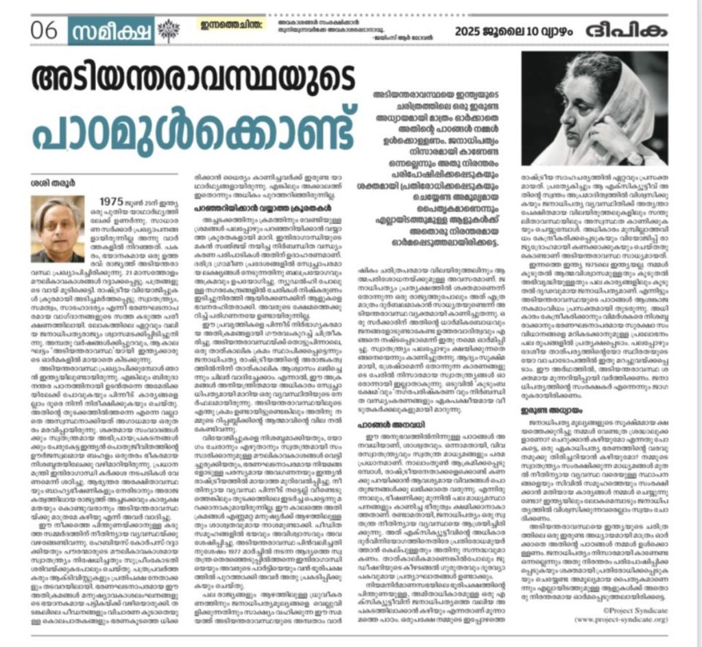 प्रोजेक्ट सिंडीकेट की तरफ से प्रकाशित लेख में थरूर ने कहा कि पूर्व प्रधानमंत्री इंदिरा गांधी के सत्तावादी नजरिये ने सार्वजनिक जीवन को डर और दमन की स्थिति में धकेल दिया। थरूर ने लिखा कि पचास साल पहले प्रधानमंत्री इंदिरा गांधी की ओर से लगाए गए आपातकाल ने दिखाया था कि कैसे आज़ादी को छीना जाता है। थरूर ने लिखा, ‘इंदिरा गांधी ने इस बात पर जोर दिया कि कठोर कदम जरूरी थे, सिर्फ आपातकाल की स्थिति ही आंतरिक अव्यवस्था और बाहरी खतरों से निपट सकती थी, और अराजक देश में अनुशासन और दक्षता ला सकती थी। जून 1975 से मार्च 1977 तक करीब दो साल तक चले आपातकाल में नागरिक स्वतंत्रताएं निलंबित कर दी गईं और विपक्षी नेताओं को जेल में भर दिया गया।