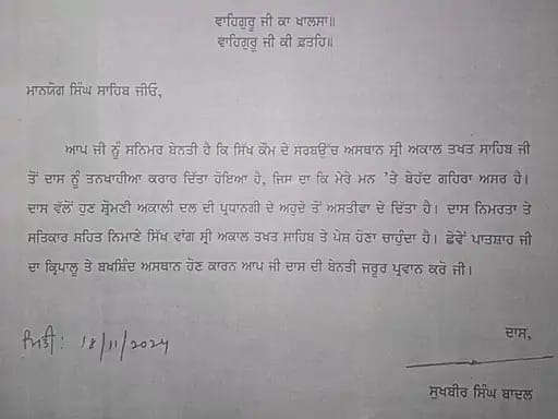 शिरोमणि अकाली दल के प्रधान सुखबीर बादल के इस्तीफा देने के बाद अब तक उसे स्वीकार नहीं किया गया हैं। इस बीच बादल का एक चिट्ठी वायरल हुई है, जिसमें उन्होंने तनखैया घोषित किए जाने के बाद अपने मन की बात रखी है।