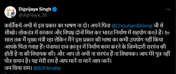 कार्तिकेय के बयान पर दिग्विजय सिंह ने पलटवार करते हुए कहा कि मैंने इस प्रकार का बयान अब तक नहीं दिया। दिग्विजय ने सोशल मीडिया प्लेटफॉर्म एक्स पर लिखा, कार्तिकये अभी से इस प्रकार का भाषण ना दो। अपने पिता शिवराज सिंह चौहान सेसीखो। लोकतंत्र में सरकार और विपक्ष दोनों मिल कर भारत निर्माण में सहयोग करते हैं। 10 साल तक मैं मुख्य मंत्री रहा लेकिन मैंने इस प्रकार की भाषा का कभी उपयोग नहीं किया आपके पिता गवाह हैं।”