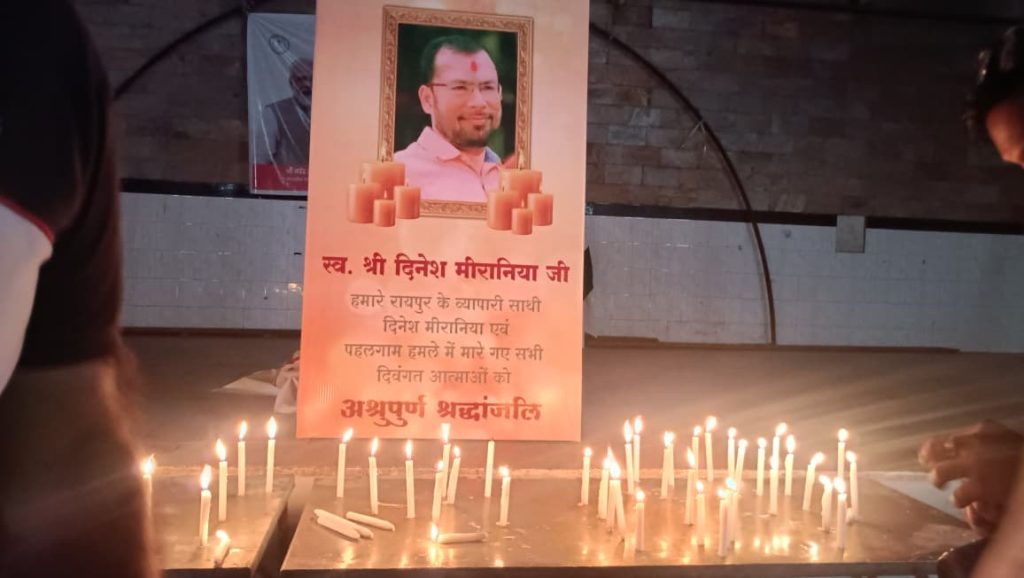 कोराबारी दिनेश मिरानिया की आतंकियों के हाथों मौत से तमाम वर्गों में दुख और रोष है. रायपुर मशीनरी मर्चेंट एसोसिएशन ने पहलगाम आतंकवादी हमले की कड़ी निंदा करते हुए शांति और एकता का संदेश लेकर आज कैंडल मार्च निकाला. रायपुर मशीनरी मर्चेंट एसोसिएशन के अध्यक्ष राजेंद्र जग्गी और सचिव अनिल दुग्गड ने कहा कि कैंडल मार्च का उद्देश्य हमले के पीड़ितों को श्रद्धांजलि देना और शांति एवं सौहार्द का संदेश फैलाना है.