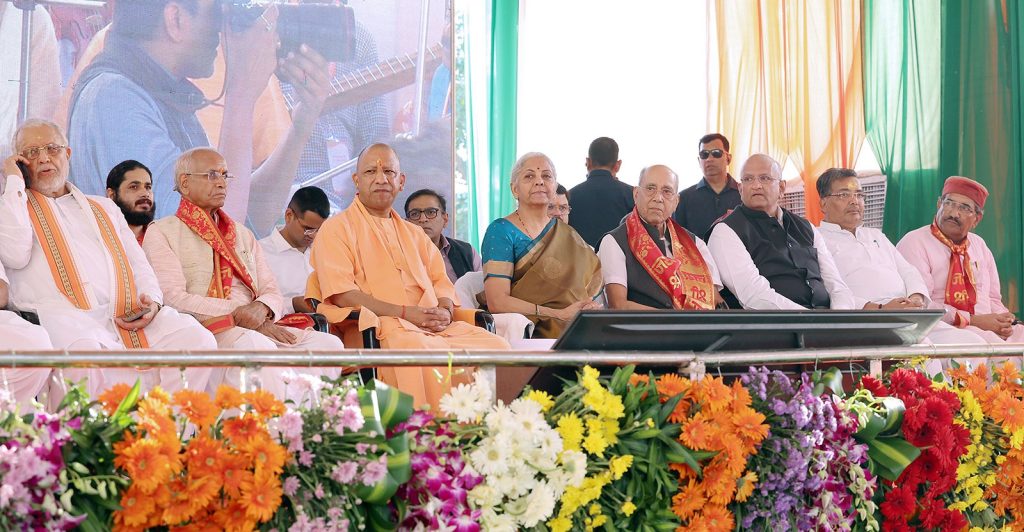 अयोध्या. मर्यादा पुरुषोत्तम प्रभु राम की पावन नगरी श्री अयोध्या धाम में बुधवार को केंद्रीय वित्त और कॉर्पोरेट कार्य मंत्री निर्मला सीतारमण के साथ सीएम योगी आदित्यनाथ बृहस्पति कुंड स्थल पर दक्षिण भारत के प्रमुख संतों की प्रतिमाओं के अनावरण के लिए आयोजित कार्यक्रम में सम्मिलित हुए. यहां उन्होंने केंद्रीय मंत्री के साथ प्रभु श्री राम की नगरी श्री अयोध्या धाम स्थित बृहस्पति कुंड स्थल पर दक्षिण भारत के प्रमुख संतों की प्रतिमाओं का अनावरण किया.