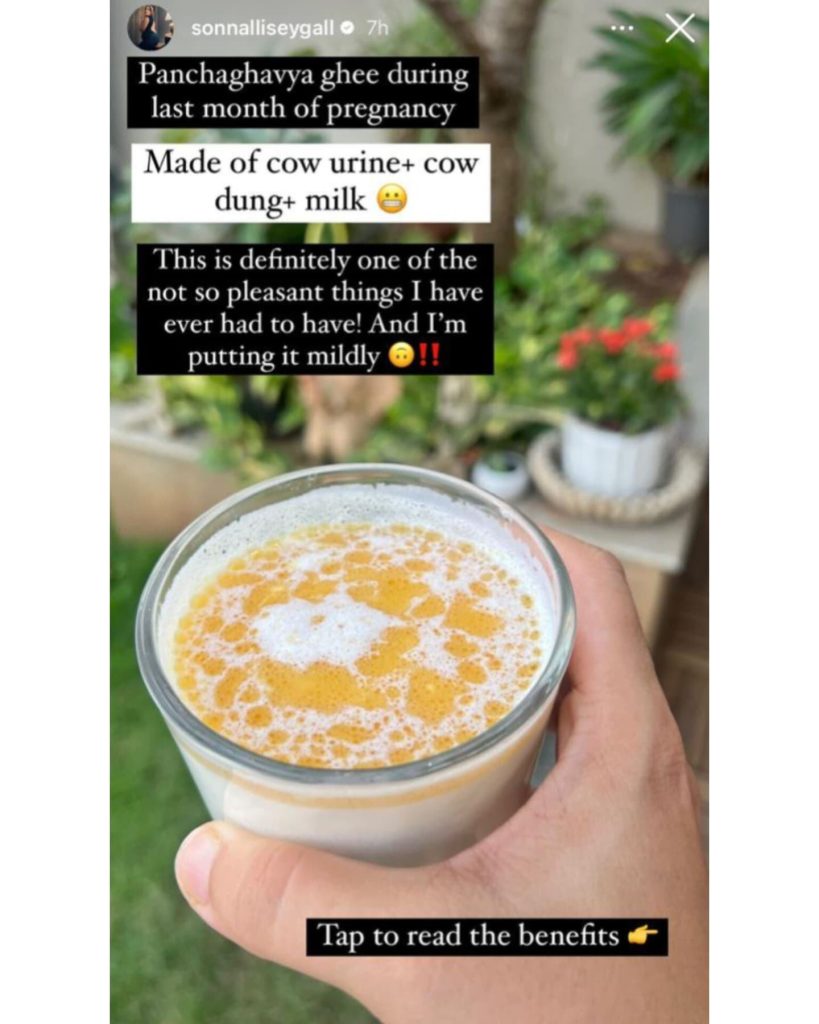 बता दें कि सोनाली सहगल (Sonnalli Seygall) ने इंस्टाग्राम स्टोरीज पर एक फोटो शेयर किया, जिसमें उन्होंने हाथ में घी का डिब्बा पकड़ा हुआ है. इसी के साथ वो पंचगव्य घी खा रही हैं. पंचगव्य का मतलब ही गाय के दूध, दही, घी, गोमूत्र और गोबर का मिश्रण होता है. Read More – 1 साल बाद Honey Singh को आई बहन की याद, सरप्राइज देने मेलबर्न पहुंचे सिंगर …