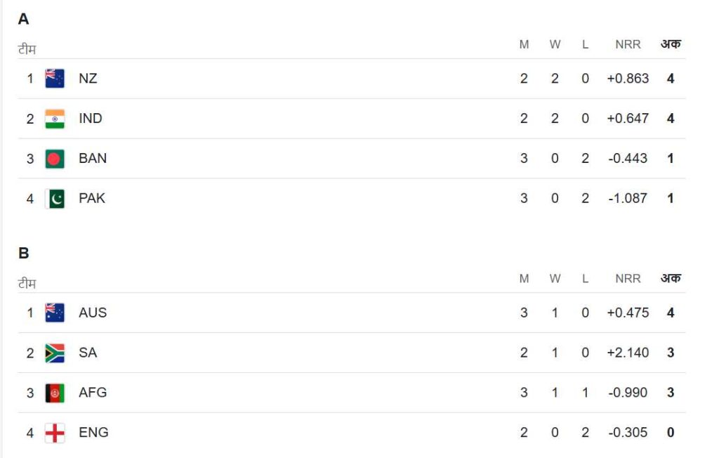 बता दें कि इस मैच से पहले यह समीकरण था कि अगर इंग्लैंड की टीम साउथ अफ्रीका को 200 रनों से ज्यादा के अंतर से हराती है तो अफगानिस्तान की किस्मत चमक जाएगी और वह सेमीफाइनल में पहुंच जाएंगे। हालांकि, इंग्लिश टीम ऐसा चमत्कार नहीं कर सकी और साउथ अफ्रीका ने उन्हें 179 रनों पर ढेर कर दिया। इसका मतलब है कि भारत, न्यूजीलैंड और ऑस्ट्रेलिया के बाद साउथ अफ्रीका ने सेमीफाइनल में अपनी जगह पक्की कर ली है। इस मैच को जीतने के बाद साउथ अफ्रीका 2 पॉइंट हासिल कर 5 पॉइंट्स के साथ ग्रुप बी के टॉप पर पहुंच जाएगी। हालांकि, यह कल तय होगा कि सेमीफाइनल में कौन सी टीम किससे मुकाबला खेलेगी, क्योंकि भारत और न्यूजीलैंड के बीच कल ग्रुप ए का आखिरी मैच खेला जाना है।