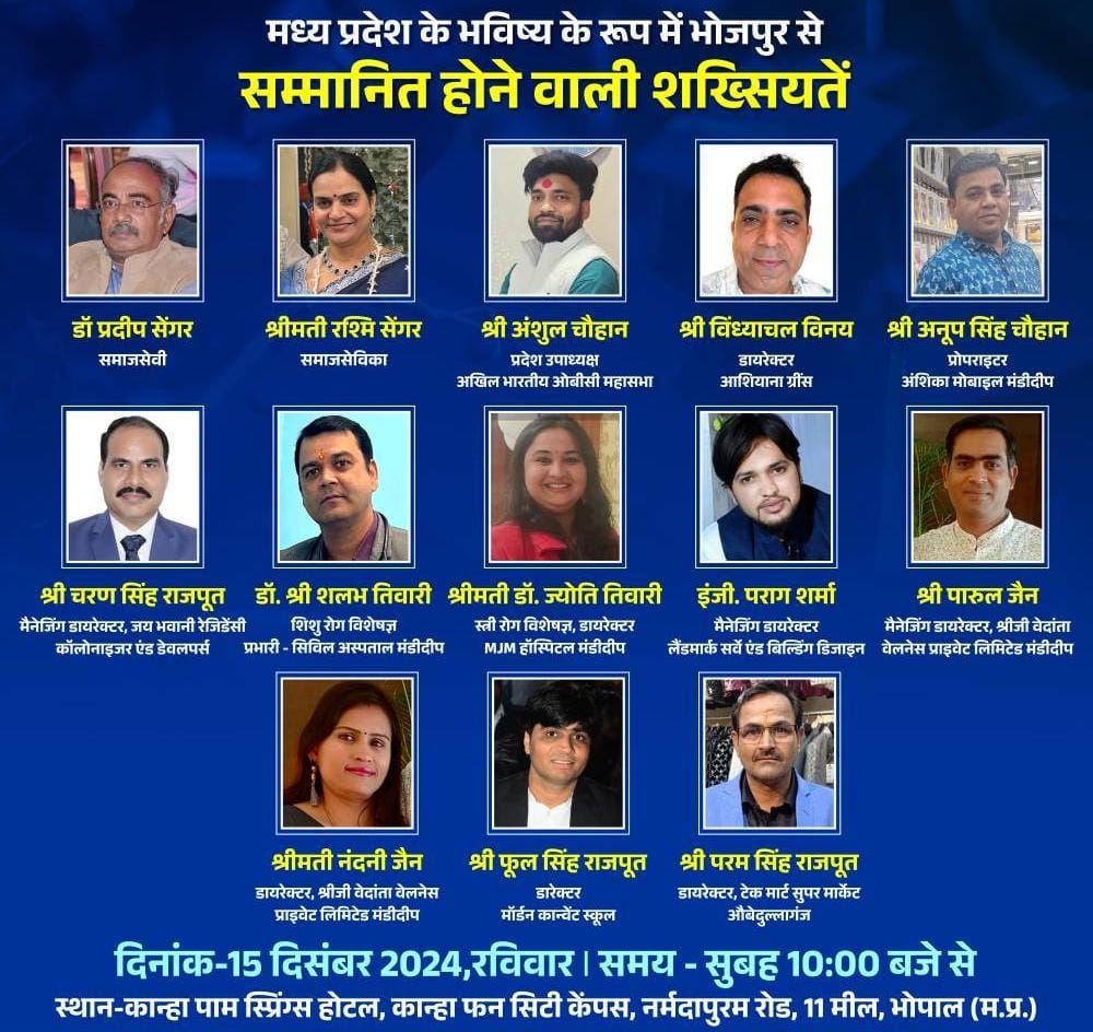 मध्य प्रदेश का भविष्य भोजपुर कार्यक्रम के दौरान डॉ. प्रदीप सेंगर समाजसेवी, रश्मि सेंगर समाजसेविका, अंशुल चौहान प्रदेश उपाध्यक्ष-अखिल भारतीय ओबीसी महासभा, विंध्याचल विनय डायरेक्टर आशियाना ग्रींस, अनूप सिंह चौहान प्रोपराइटर अंशिका मोबाइल मंडीदीप, चरण सिंह राजपूत एमडी जय भवानी रेजिडेंसी कॉलोनाइजर एंड डेवलपर्स, डॉ.शलभ तिवारी-प्रभारी सिविल अस्पताल मंडीदीप, डॉ. ज्योति तिवारी डायरेक्टर-एमजेएम हॉस्पिटल मंडीदीप, पराग जैन-एमडी लैंडर्माक सर्वे एंड बिल्डिंग डिजाइन, पारूल जैन-एमडी श्रीजी वेदांता वेलनेस प्राइवेट लिमिटेड मंडीदीप, नंदनी जैन-डायरेक्टर श्रीजी वेदांता वेलनेस प्राइवेट लिमिटेड, फूल सिंह राजपूत-डायरेक्टर मोर्डन कान्वेंट स्कूल, परम सिंह राजपूत-डायरेक्टर टेक मार्ट सुपर मार्केट, औबेदुल्लागंज को सम्मानित किया जाएगा।