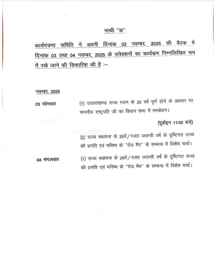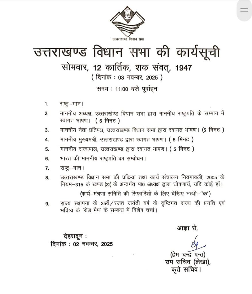 देहरादून. उत्तराखंड राज्य स्थापना के अवसर पर आयोजित रजत जयंती समारोह की कड़ी में धामी सरकार ने रजत जयंती के पहले 3 और 4 नवंबर को विधानसभा का विशेष सत्र बुलाया है. इसे लेकर कार्यसूची जारी की गई है. जिसके मुताबिक पूर्वान्ह 11 बजे सदन की कार्रवाई शुरू होगी. जिसमें राष्ट्रपति के आगमन के बाद सबसे पहले राष्ट्रगान होगा.