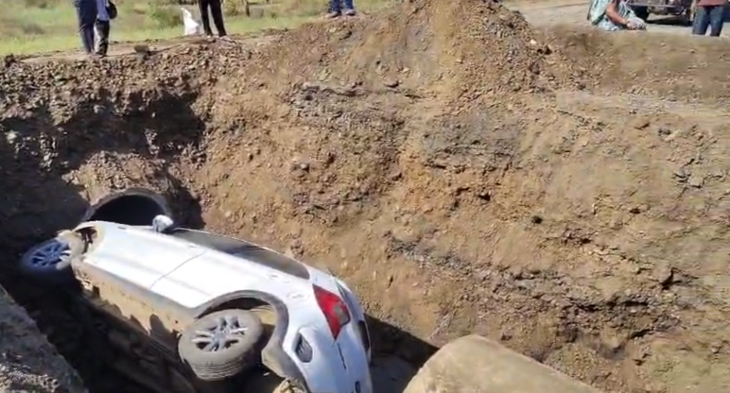 गड्ढे में गिरी कार