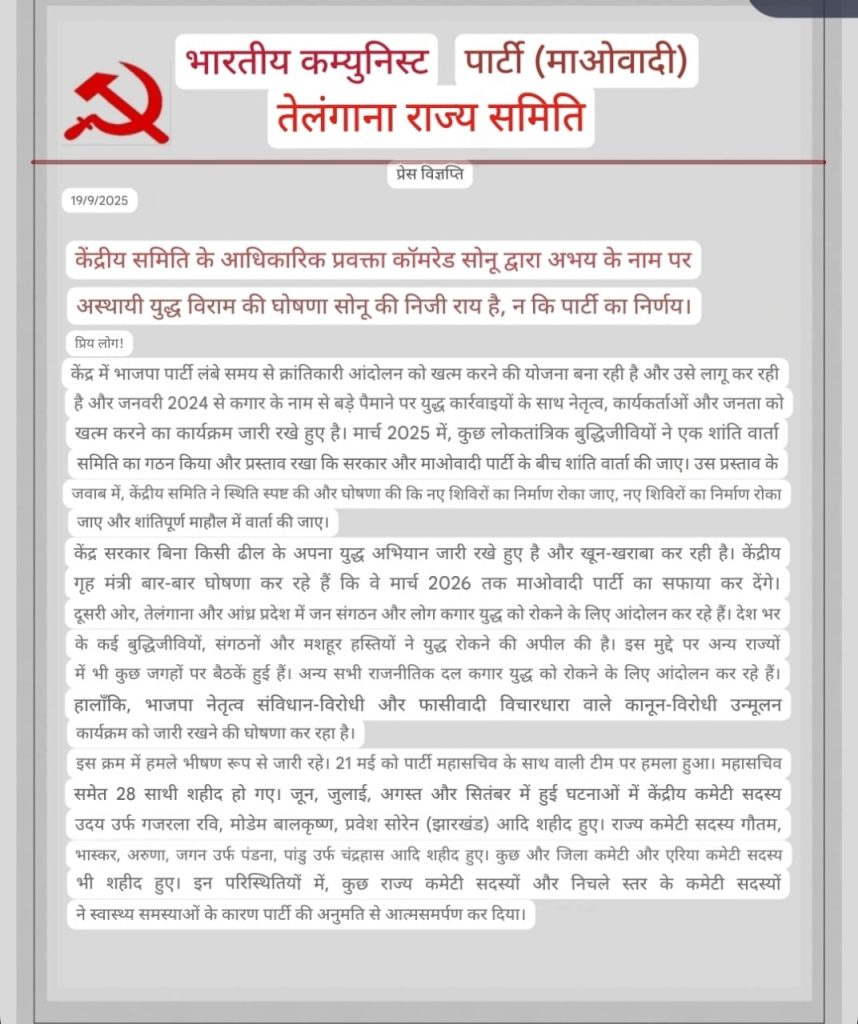 तेलंगाना स्टेट कमेटी के प्रवक्ता ने साफ किया कि सोनू का युद्धविराम बयान निजी राय है। माओवादी पार्टी ने कहा कि भाजपा सरकार “कगार युद्ध” चला रही है और मार्च 2026 तक संगठन का सफाया करने की घोषणा है। पिछले समय में पार्टी महासचिव समेत 28 कैडर 21 मई की मुठभेड़ में मारे गए, जबकि कई शीर्ष नेता हाल ही में ढेर हुए। इसके अलावा कुछ राज्य और जिला कमेटी के सदस्य स्वास्थ्य कारणों से आत्मसमर्पण कर चुके हैं। बुद्धिजीवियों और संगठनों ने शांति वार्ता की मांग की, लेकिन सरकार दमन अभियान जारी रखे हुए है।