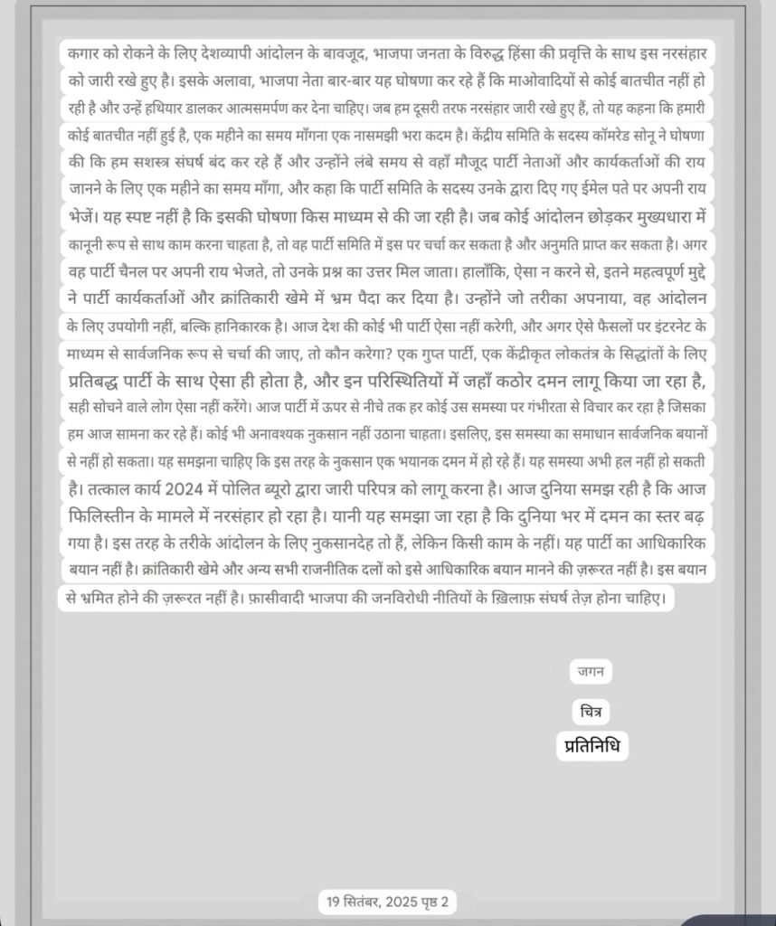 बता दें कि 16 सितंबर को केंद्रीय प्रवक्ता अभय का पत्र सोशल मीडिया पर वायरल हुआ था, जिसमें अभय ने सरकार के साथ शांति वार्ता के तैयार होने की बात कही। साथ ही हथियार छोड़कर भविष्य में जनसमस्याओं को लेकर देश की राजनैतिक पार्टियों और संघर्षरत संस्थाओं के साथ कंधे से कंधा मिलाकर काम करने की बात भी कही।
