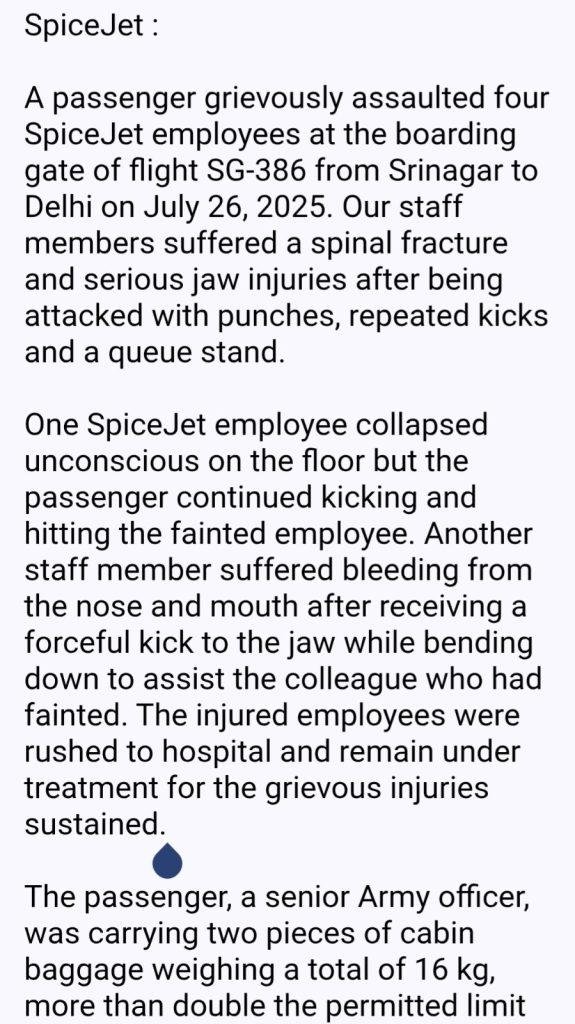 घटना श्रीनगर से दिल्ली जाने वाली स्पाइसजेट की फ्लाइट SG-386 के बोर्डिंग गेट पर हुई। एक वरिष्ठ सेना अधिकारी ने चार स्पाइसजेट कर्मचारियों को बुरी तरह पीट दिया। एयरलाइन के प्रवक्ता के अनुसार, घटना 26 जुलाई को उस समय हुई जब अधिकारी को अतिरिक्त कैबिन बैगेज ले जाने पर अतिरिक्त चार्ज देने के लिए कहा गया। इससे आर्मी ऑफिसर उग्र हो गया।