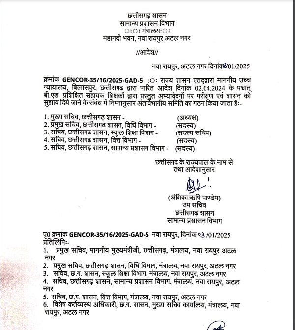 जारी आदेश के अनुसार, कमेटी का अध्यक्ष मुख्य सचिव अमिताभ जैन को बनाया गया है. इस कमेटी में प्रमुख सचिव विधि विभाग, सचिव स्कूल शिक्षा विभाग, सचिव वित्त विभाग और सचिव सामान्य प्रशासन विभाग को सदस्य बनाया गया है. यह समिति सहायक शिक्षकों के अभ्यावेदन पर अपनी रिपोर्ट देगी.