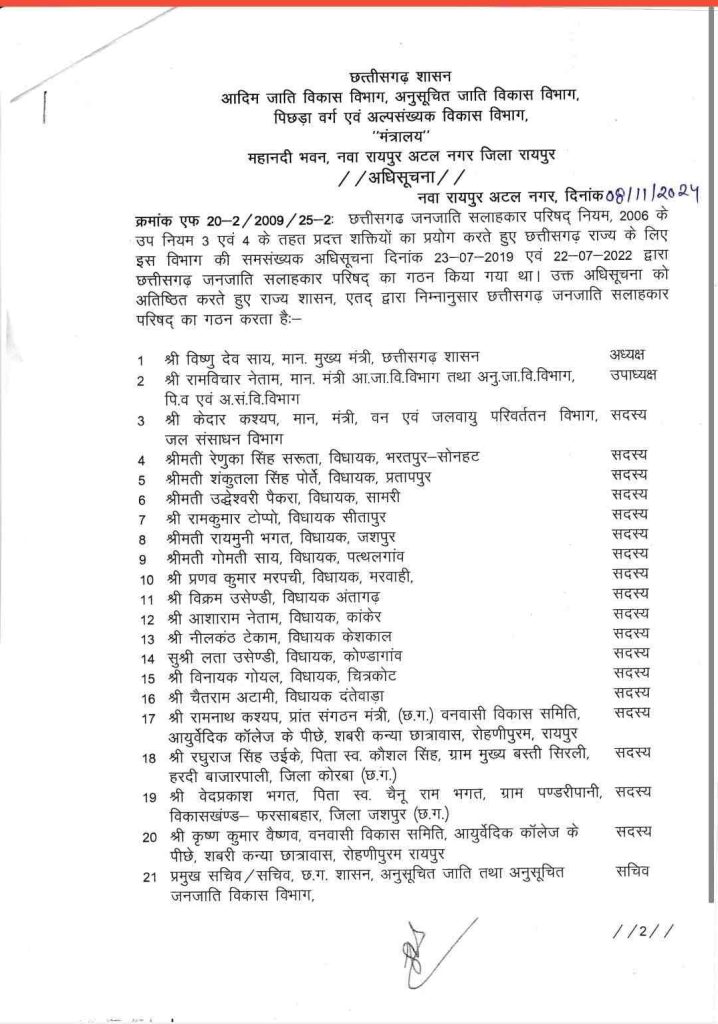 रायपुर. साय सरकार ने जनजातीय सलाहकार परिषद का गठन किया है. मुख्यमंत्री विष्णुदेव साय को परिषद के अध्यक्ष बनाए गए हैं. वहीं मंत्री रामविचार नेताम को उपाध्यक्ष की जिम्मेदारी दी गई है. इस परिषद में मंत्री केदार कश्यप सहित 15 विधायकों को सदस्य बनाए गए हैं.