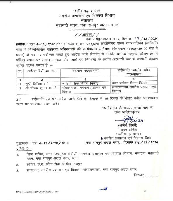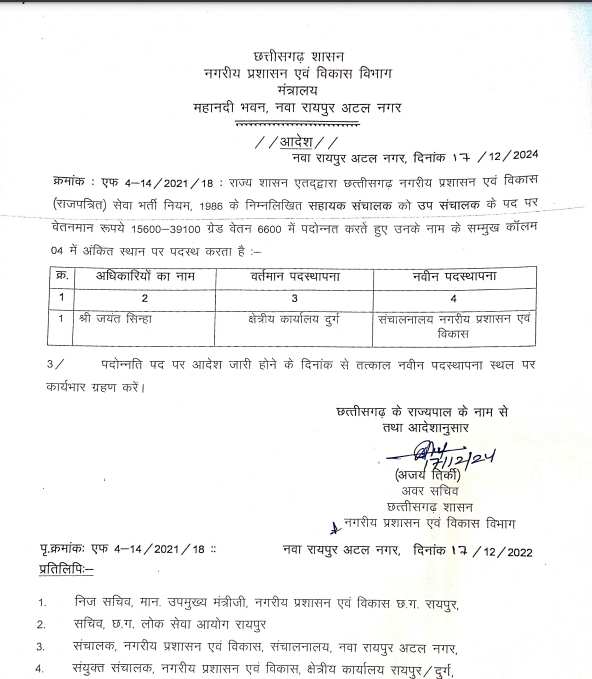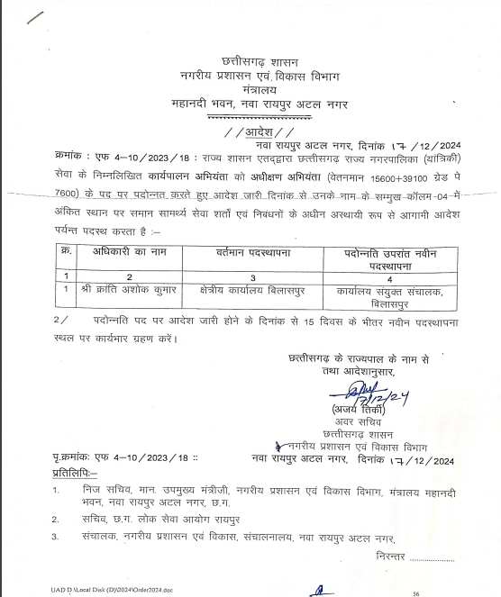 रायपुर। राज्य शासन ने नगरीय प्रशासन एवं विकास विभाग के अधिकारियों को पदोन्नति के साथ नई जिम्मेदारियां सौंपी हैं. शासन की ओर से जारी आदेश में चार अधिकारियों की पदोन्नति के साथ नवीन पदस्थापना की जानकारी दी गई है.