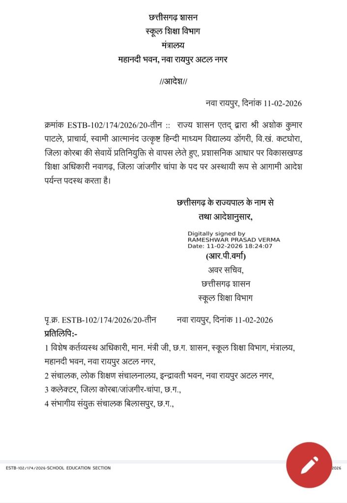 राज्य शासन द्वारा अशोक कुमार पाटले, प्राचार्य, स्वामी आत्मानंद उत्कृष्ट हिंदी माध्यम विद्यालय डोंगरी, विकासखंड कटघोरा, जिला कोरबा की सेवाएं प्रति व्यक्ति से वापस लेते हुए प्रशासनिक आधार पर विकासखंड शिक्षा अधिकारी नवागढ़, जिला जांजगीर–चांपा के पद पर पदस्थ किया गया है।