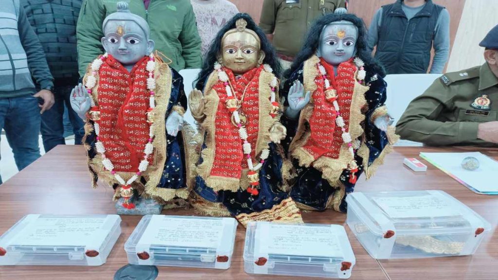दरअसल, 13-14 जनवरी की रात मंदिर से श्रीराम, लक्ष्मण और माता जानकी के अष्टधातु की अति प्राचीन मूर्ति चोरी हो गई. जिसकी जानकारी सुबह होते ही गांव में हड़कंप मच गया. सूचना पर पहुंची पुलिस ने मौके का मुआयना किया. इस संदर्भ में मंदिर के पुजारी बंशीधर गुरु महामंडलेश्वर जय रामदास महाराज ने थाने में तहरीर दी. प्राचीन मंदिर में हुई करोड़ों की अष्टधातु की मूर्ति चोरी की घटना को गंभीरता से लेते हुए जनपद के नवागत पुलिस अधीक्षक सोमेन वर्मा ने घटना के खुलासा एवं चोरी की गई मूर्तियों के बरामदगी के लिए टीम गठन के निर्देश दिए. जिस पर जांच शुरु हुई. इसी दौरान मुखबिर की सूचना के आधार पर पुलिस ने पड़री थाना क्षेत्र अंतर्गत हाईमाई मंदिर के पास से बोलेरो सवार चार लोगों को संदिग्ध परिस्थितियों में देख दबोच लिया. जिसमें सवार लोगों की पहचान कराई गई तो मंदिर के पुजारी बंशीदास, जिन्होंने इस चोरी के प्रकरण की तहरीर दी थी, साथ ही लवकुश पाल, मुकेश कुमार सोनी और राम बहादुर पाल के रुप में पहचान हुई.