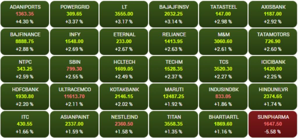 सेंसेक्स के 30 में से 29 शेयरों में तेजी है। अडाणी पोर्ट्स, बजाज फाइनेंस, एक्सिस बैंक सहित 17 शेयर्स 4.5% तक ऊपर हैं। जबकि अकेला सनफार्मा 5.5% गिरा है।