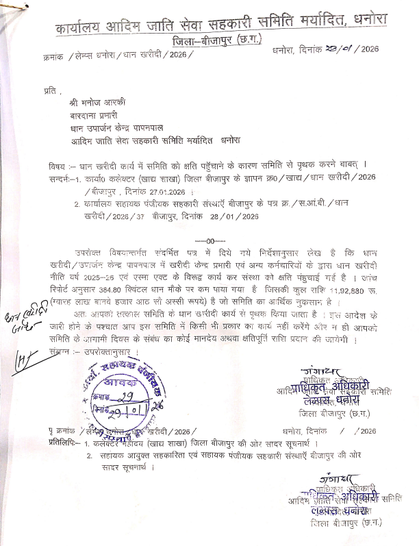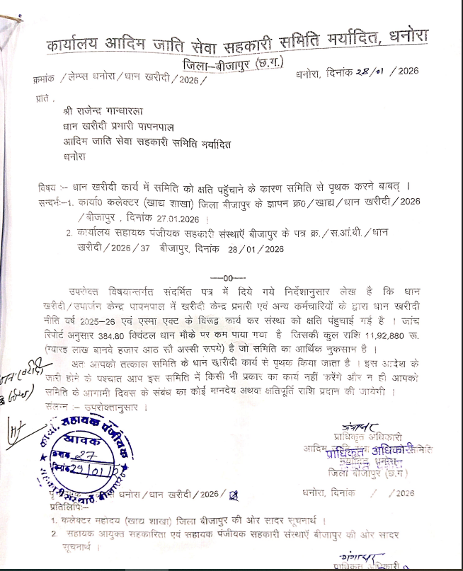 बीजापुर। छत्तीसगढ़ के बीजापुर जिले में धान खरीदी प्रक्रिया में बड़ी लापरवाही और धांधली का मामला सामने आया है. कलेक्टर संबित मिश्रा के कड़े रुख के बाद, पापनपाल उपार्जन केंद्र में मिली गंभीर अनियमितताओं के चलते खरीदी प्रभारी और ऑपरेटर को धान खरीदी कार्य और समिती से हटा दिया गया है.