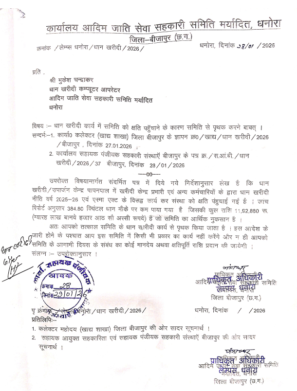 मामले की गंभीरता को देखते हुए समिति की प्रबंध कार्यकारिणी ने खरीदी प्रभारी और ऑपरेटर को दोषी मानते हुए उन्हें पद से हटा दिया है. तहसीलदार बीजापुर ने इस मामले में FIR दर्ज करने के निर्देश भी जारी कर दिए हैं. सहायक आयुक्त सहकारिता को विस्तृत जांच रिपोर्ट के आधार पर कानूनी कार्रवाई सुनिश्चित करने को कहा गया है.