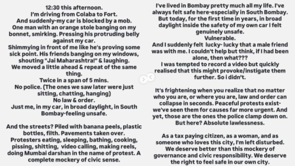 सुमोना चक्रवर्ती (Sumona Chakravarti) ने कहा-‘ प्रदर्शनकारी विरोध के नाम पर खा रहे हैं, सो रहे हैं, नहा रहे हैं, खाना बना रहे हैं, पेशाब कर रहे हैं, शौच कर रहे हैं, वीडियो कॉल कर रहे हैं, रील बना रहे हैं, मुंबई दर्शन कर रहे हैं. नागरिक भावना का पूरी तरह से मजाक उड़ाया जा रहा है. मैं लगभग पूरी जिंदगी बॉम्बे में ही रही हूं. मुझे यहां हमेशा सुरक्षित महसूस हुआ है. खासकर साउथ बॉम्बे में. लेकिन आज, बरसों बाद पहली बार, दिन के उजाले में अपनी ही कार की सुरक्षा में, मुझे सचमुच असुरक्षित महसूस हुआ. असुरक्षित. और अचानक मुझे लगा कि मैं खुशकिस्मत हूं. खुशकिस्मत कि एक मेल फ्रेंड मेरे साथ था. मैं सोचने से खुद को रोक नहीं पाई, अगर मैं अकेली होती, तो क्या होता? मेरा मन तो वीडियो रिकॉर्ड करने का हुआ, लेकिन जल्दी ही मुझे एहसास हुआ कि इससे वो और भड़क सकते हैं. इसलिए मैंने ऐसा नहीं किया. ये डरावना लगता है जब आपको एहसास होता है कि आप चाहे कोई भी हों, या कहीं भी हों, कानून-व्यवस्था पल भर में बर्बाद हो सकती है. प्रोटेस्ट शांति से भी हो सकता है. हमने देखा है. और फिर भी, पुलिस उन्हीं पर शिकंजा कसती है. लेकिन यहां? पूरी तरह अराजकता.’
