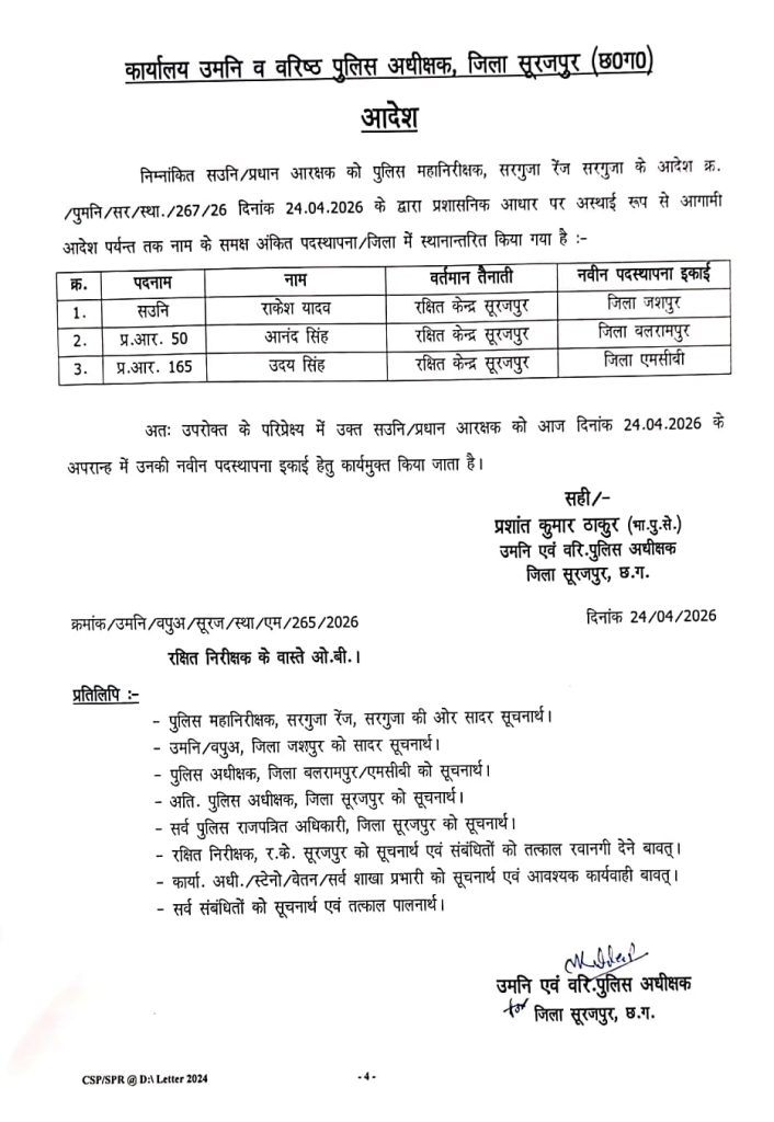 जानकारी के अनुसार, साइबर प्रभारी राकेश यादव को जशपुर, आनंद सिंह को बलरामपुर और उदय सिंह को एमसीबी जिले में स्थानांतरित किया गया है। यह कार्रवाई सरगुजा रेंज IG के निर्देश पर की गई है। सूरजपुर एसएसपी प्रशांत ठाकुर ने तीनों पुलिसकर्मियों को तत्काल प्रभाव से कार्यमुक्त कर दिया है।