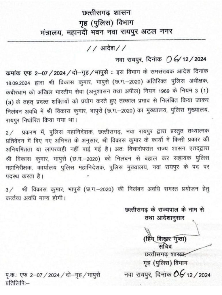 रायपुर। छत्तीसगढ़ के निलंबित आईपीएस अधिकारी विकास कुमार (IPS Vikas Kumar) को बहाल कर दिया है। कवर्धा के लोहारीडीह घटना के बाद उन्हें निलंबित कर दिया गया था. तथ्यात्मक प्रतिवेदन में विकास कुमार के विरुद्ध किसी प्रकार की अनियमितता या लापरवाही नहीं पाई गई. इस आधार पर राज्य शासन ने विकास कुमार को बहाल कर दिया है. साथ ही उन्हें पुलिस मुख्यालय में सहायक पुलिस महानिरीक्षक के पद पर पदस्थ किया गया है.