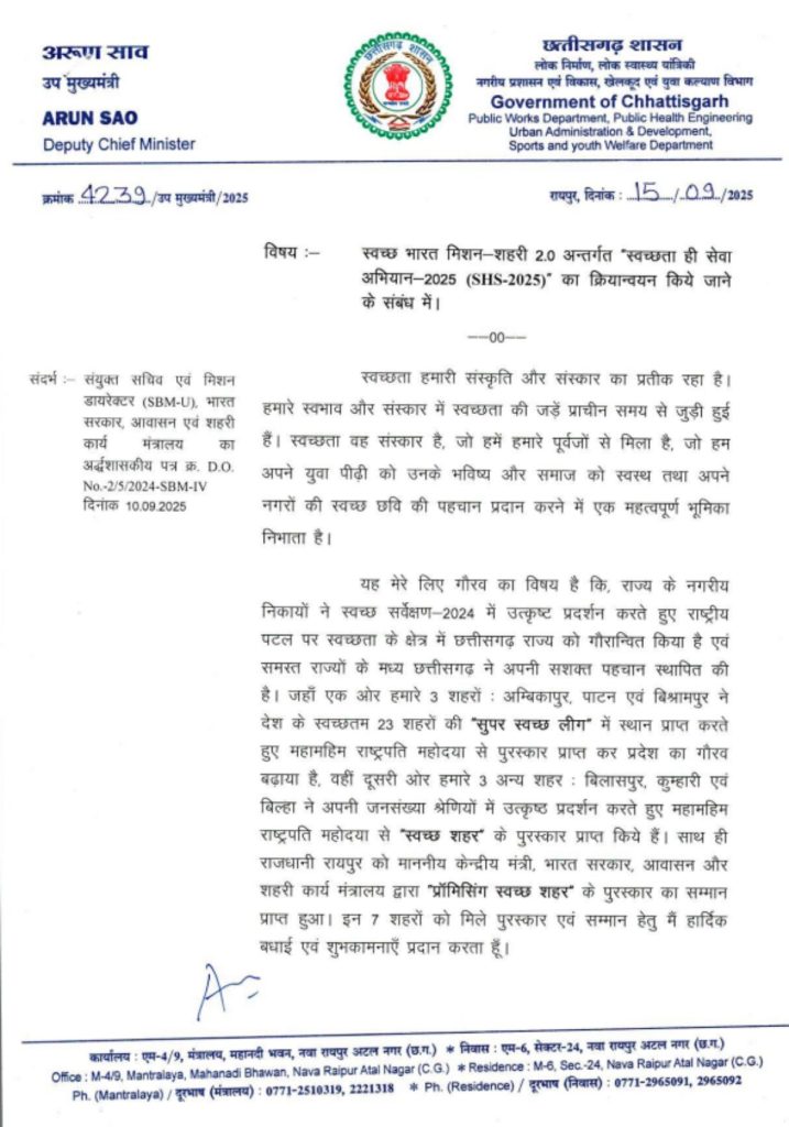 सत्या राजपूत, रायपुर। छत्तीसगढ़ में एक बार फिर स्वच्छता को जनआंदोलन का रूप देने की तैयारी है। राज्य के डिप्टी CM और लोक निर्माण, नगरीय प्रशासन, खेल एवं युवा कल्याण मंत्री अरुण साव ने आदेश जारी कर सभी नगरीय निकायों को ‘स्वच्छता ही सेवा अभियान-2025 (SHS-2025)’ के क्रियान्वयन के लिए विस्तृत दिशा-निर्देश दिए। यह अभियान 17 सितंबर से 2 अक्टूबर 2025 तक पूरे प्रदेश में चलेगा।
