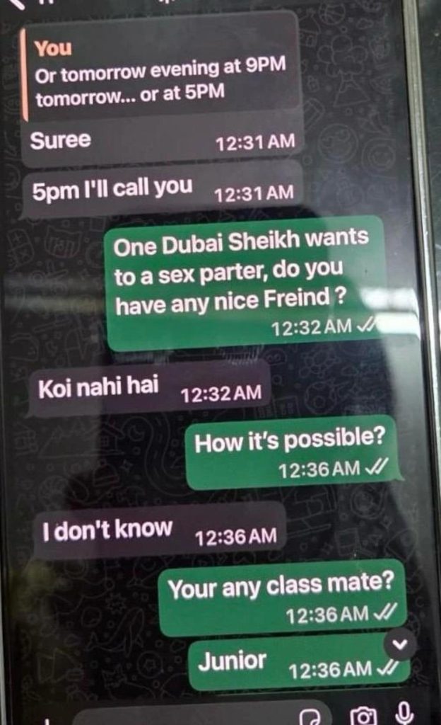 सबसे सनसनीखेज चैट तब सामने आई, जब उसने एक लड़की से लिखा कि दुबई का एक शेख सेक्स पार्टनर चाहता है, क्या तुम्हारी कोई अच्छी दोस्त है? जब लड़की ने मना कर दिया और कहा कि उसके पास कोई नहीं है, तो स्वामी ने दबाव डालते हुए पूछा कि ये कैसे संभव हो सकता है? तुम्हारी कोई क्लास मेट, जूनियर हो तो भेजो। इससे साफ है कि बाबा लड़कियों को न केवल खुद इस्तेमाल करता था, बल्कि उन्हें विदेश भेजने की भी कोशिश करता था।