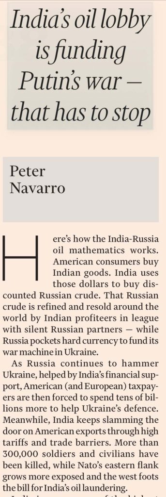 नवारो ने दोनों देशों के बीच बढ़ते तनाव को और हवा देते हुए कहा किभारत की रूस से तेल खरीद मास्को को यूक्रेन युद्ध जारी रखने के लिए आर्थिक मदद पहुंचा रही है। फाइनेंशियल टाइम्स में लिखे लेख में पीटर नवारो ने कहा कि भारत वैश्विक क्लीयरिंग हाउस की तरह काम कर रहा है और रूस के प्रतिबंधित तेल को प्रोसेस कर महंगे निर्यात में बदलकर मॉस्को को डॉलर उपलब्ध कराता है।