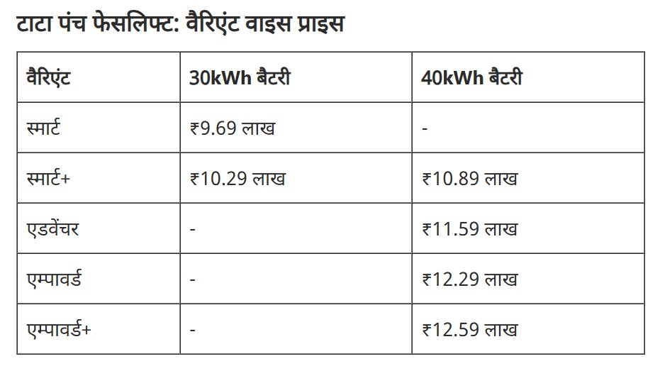 कीमत ₹9.69 लाख से शुरू होती है, जो टॉप वेरिएंट के लिए 12.59 लाख तक जाती है. टाटा ने नई पंच EV को पाँच ट्रिम लेवल्स में पेश किया है. इसमें स्मार्ट, स्मार्ट+, एडवेंचर, एम्पावर्ड, और एम्पावर्ड+. इलेक्ट्रिक कार का नया बेस वेरिएंट पुराने मॉडल से 30,000 सस्ता है, जबकि बड़ी बैटरी वाला टॉप वेरिएंट अब ₹1.85 लाख ज़्यादा सस्ता है. कार की बुकिंग शुरू हो गई है, और डिलीवरी जल्द ही शुरू होगी.