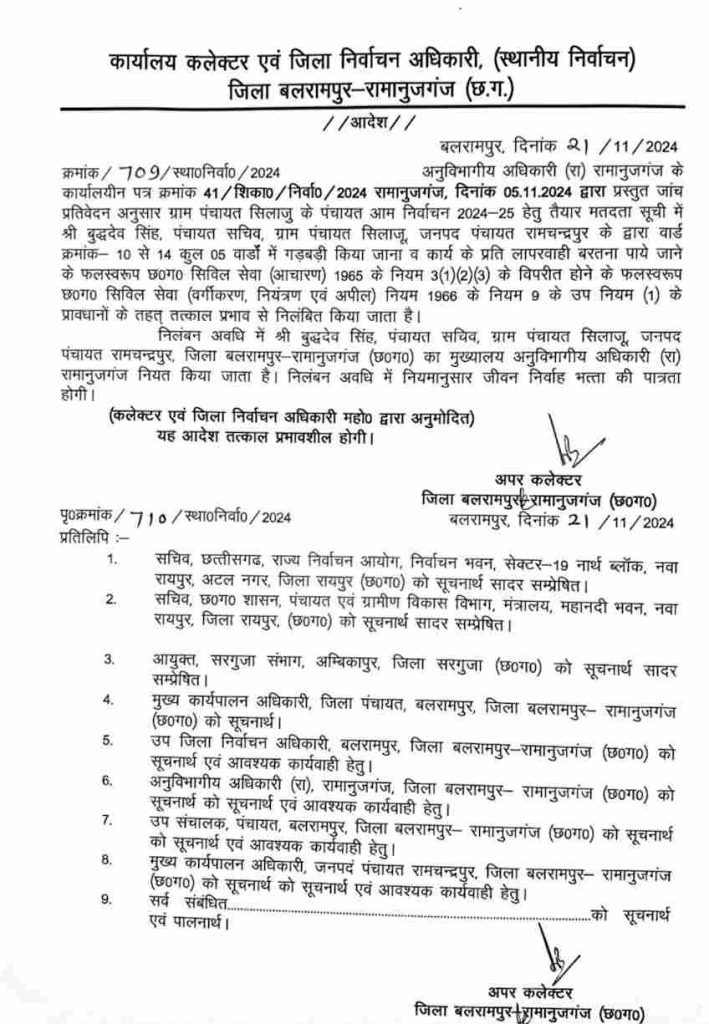सुदीप उपाध्याय, बलरामपुर। मतदाता सूची तैयार करने में लापरवाही बरतने पर शिक्षक और पंचायत सचिव पर निलंबन की गाज गिरी है. निलंबन अवधि में दोनों को निर्वाचन कार्यालय में अटैच किया गया है. यह भी पढ़ें : Exclusive: नागपुर से रायपुर ट्रेन से आएंगे रेल मंत्री, रेलवे ने शुरू की तैयारी