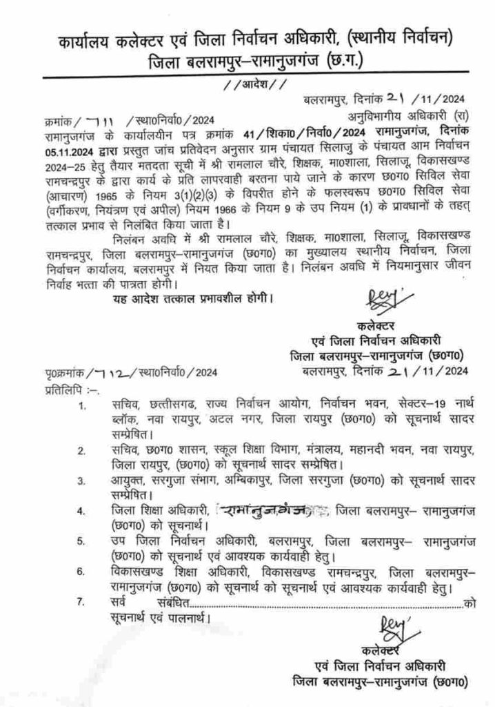 आम निर्वाचन 2024-25 के लिए तैयार मतदाता सूची किया जा रहा है. इस दौरान कार्य में लापरवाही बरतने पर माध्यमिक शाला सिलाजु में पदस्थ शिक्षक रामलाल चौरे और ग्राम पंचायत सिलाजू में पदस्थ पंचायत सचिव बुद्धदेव सिंह को निलंबित किया गया है. निलंबन की कार्रवाई कलेक्टर एवं जिला निर्वाचन अधिकारी ने की है.