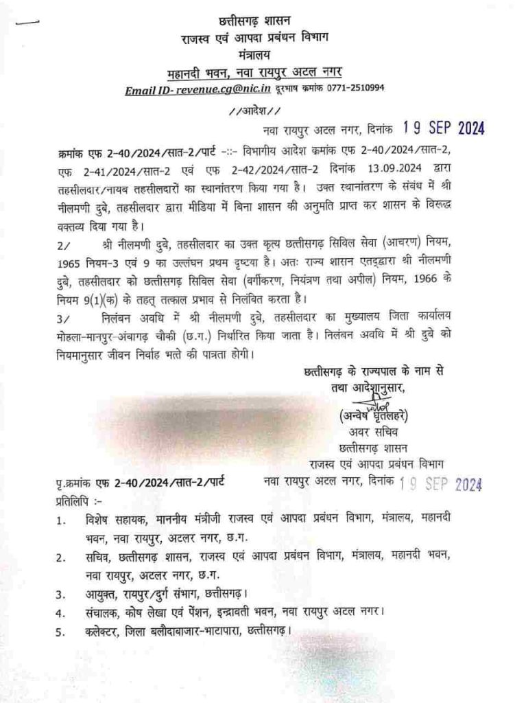 आदेश में कहा गया है कि नीलमणि दुबे ने शासन के खिलाफ मीडिया में वक्तव्य दिया था, जो छत्तीसगढ़ सिविल सेवा अधिनियम का उल्लंघन है. ऐसे में उन्हें तत्काल प्रभाव से निलंबित किया जा रहा है. निलंबन अवधि में उनका कार्यालय मोहला-मानपुर-अंबागढ़ चौकी जिला होगा.