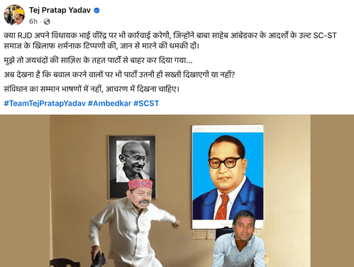 तेज प्रताप यादव ने महात्मा गांधी और डॉ भीम राव अंबेडकर के बैकग्राउंट की तस्वीर में भाई वीरेंद्र को हाथ में जूता लिए दिखाया है और पंचायत सचिव को कुर्सी पर बैठे हुए. उन्होंने अपने पोस्ट में लिखा, क्या RJD अपने विधायक भाई वीरेंद्र पर भी कार्रवाई करेगी, जिन्होंने बाबा साहेब आंबेडकर के आदर्शों के उल्ट SC-ST समाज के खिलाफ शर्मनाक टिप्पणी की, जान से मारने की धमकी दी. मुझे तो जयचंदों की साजिश के तहत पार्टी से बाहर कर दिया गया…अब देखना है कि बवाल करने वालों पर भी पार्टी उतनी ही सख्ती दिखाएगी या नहीं? संविधान का सम्मान भाषणों में नहीं, आचरण में दिखना चाहिए.